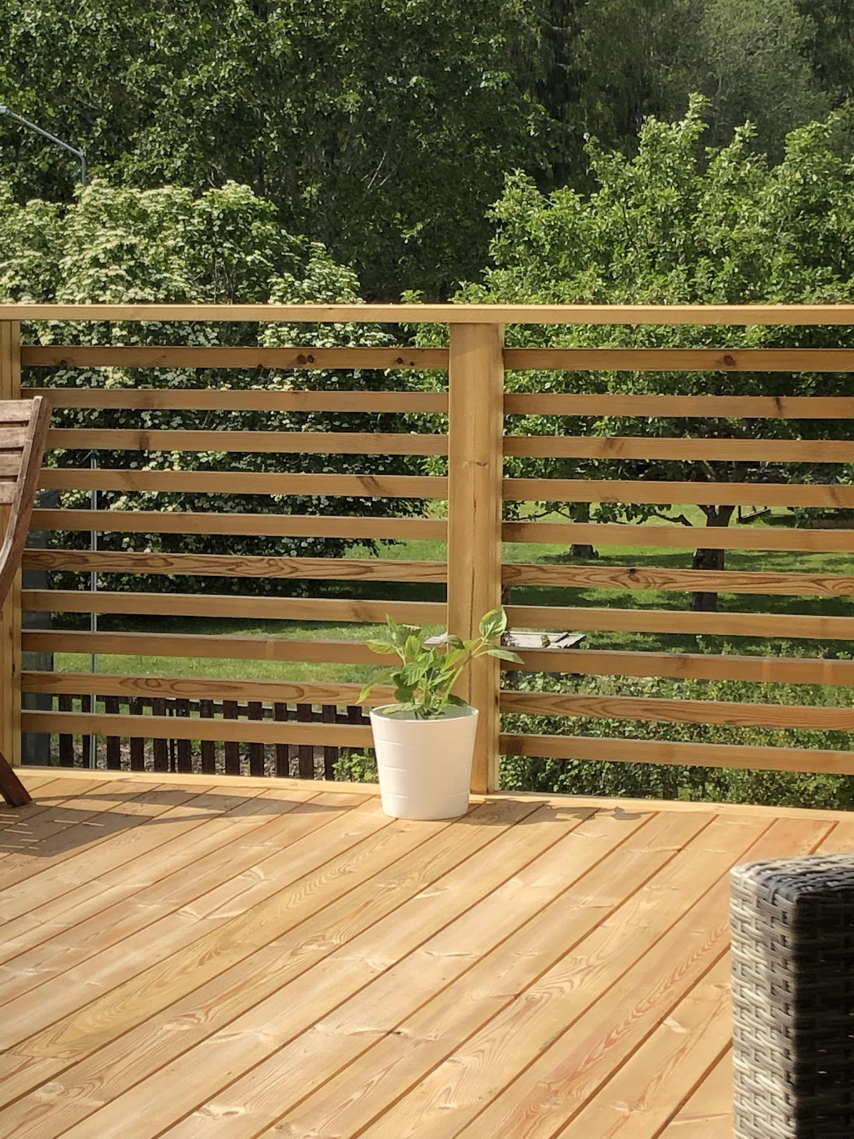 Förra året målade vi huset så att påstå att jag var inne hela sommaren är att ljuga ganska mycket. Sällan har jag väl varit så mycket utomhus som under de fyra veckor jag ständigt stod på en stege, en ställning eller var upphissad i en korg under taket. Vanligtvis går jag inte ut i trädgården här hemma utan brukar ha altandörren öppen för att vara ”ute” om jag inte grejar med något i trädgården. Vi har alltid haft uteplats på nedervåningen men jag har aldrig trivts där. Alltid ska det släpas saker upp och nerför trappen om jag ska sitta ute och det måste gås upp och nerför trappen för att ta in dynor på kvällen och vattna blommor som behövs för att få någon slags mysighetsfaktor. Så vill jag vara ute har jag tagit mitt pick och pack och dragit till stugan där det bara finns en våning och mycket uteplats. Så sedan något år tillbaka började vi prata om att göra terass på övervåningen. Förra året fick jag också en insikt att matbord med stolar inte är vad jag önskar på en uteplats eftersom jag inte är så förtjust i att sitta raktuppochner i en stol. Jag vill krypa upp i sköna möbler med sköna dynor och läsa en bok eller bara hänga. Så när altanen på övervåningen var klar så beställde vi bara sköna möbler för häng till att börja med (som ni ju redan vet utifrån tidigare inlägg). Och utan att överdriva kan jag säga att nu sitter jag ute varje dag. Undantag vid spöregn såklart men annars har nya altanen blivit som ett extra rum utan tak.